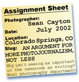 PHOTOJOURNALISM, NOT LESS Why isn't seeing as important in the newsroom as writing? Most photography departments today remain service bureaus. The everyday job of newspaper photographers is to fulfill the photo requests of their counterparts - the writers. It's expected that photographs be 'eye-catching' and graphic illustrations for the story. I think it's fair to say that few newspapers display pictures that actually tells the story. Instead, newspapers use photography to dress up the newsprint. Of course it depends on what kind of newsprint it is. For example, the business section of one of my local papers has a fondness for 'annual report' style portraits of corporate executives. Gels are often used to jazz up the backgrounds. In the sports section, there is a generous helping of practice shots on a slow news day. And the news sections are usually a hodgepodge of wire/celebrity photos, hurried pictures profiling some community-oriented subject, a few feature pictures of children and the occasional car wreck. Rarely, and I emphasize rarely, is there a story telling picture prominently displayed in any of its sections. And what little story telling is done is saved for the Sunday edition or a special section. The initiative to tell a story in pictures has all but disappeared from the landscape of newspaper photography in the U.S. But more to the point, the initiative to tell a story in pictures with journalistic insight has disappeared. Compelling picture stories are being told in other parts of the world. The New York Times, for example, recently published a picture story on its web site about a Muslim court in Nigeria that condemned a woman to death for adultery. Magnum photographer Martin Parr said in an interview in the August 2002 issue of Photo District News that photographers in the U.S. (and I take it that he includes newspaper photographers) are too considerate. His point? There are stories here that aren't being told. And, he says, he will take advantage of that neglect by U.S. photographers and work here in the coming years. The obvious question to me is why aren't newspaper photographers doing this sort of work? I think that answer lies somewhere between job security for photographers on staff at daily papers and the agenda of a newsroom that doesn't include serious photojournalism as part of its mission. When was the last time newspapers and, more to the point, newspaper photographers took a serious look at life in the U.S. en masse? The Civil Rights era comes to mind and also the work of Farm Securities Administration photographers like Gordon Parks. Robert Frank's book The Americans is another. But I'll concede that Frank or Parks and the other FSA photographer weren't newspaper photographers. And so what? Don't we