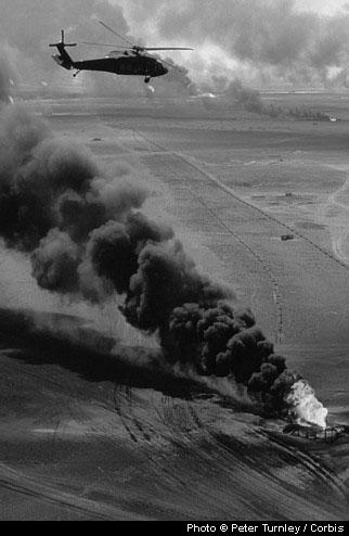 An Allied Forces helicopter patrols above the burning oil fields in Kuwait. Before retreating from Kuwait, Iraqi forces blew up many of the oil rigs and refineries in Kuwait, resulting in a mass number of oil rigs burning out of control and leaving the skies black. It took over a year for foreign specialists to put out these fires and restore the rigs. |