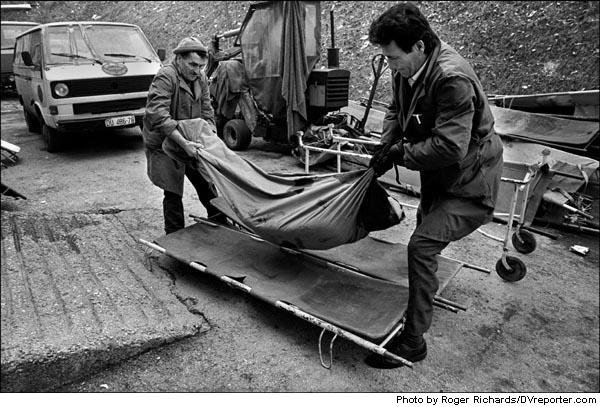 Morgue attendants lift the body of a 16-year-old girl, killed on a Sunday morning when a Serb shell hit her house and a piece of shrapnel cracked her skull open, Sarajevo, Bosnia-Herzegovina, February 1993. |