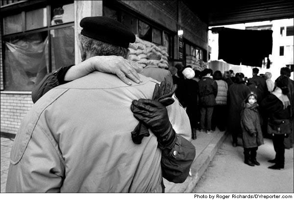 A husband and wife greet each other after four years of separation, on the Serb-side of the Bratstvo i Jedinstvo Most (Brotherhood and Unity bridge) during the final days of the division of the city, Sarajevo, Bosnia and Herzegovina, February 1996. |