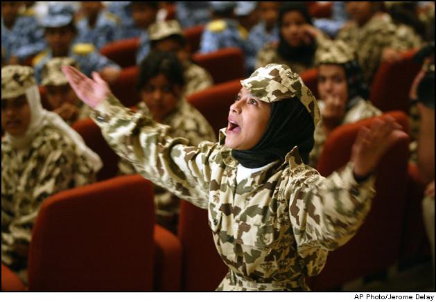 A young Iraqi girl in military uniform shouts patriotic slogans during a gathering celebrating the 30th anniversary of the foundation of the general federation of Iraqi youth, a branch of the Baath party, in Baghdad Sunday Oct 27 2002. |