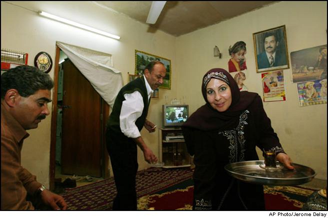 Sumeyah Obeit, right, offers a visitor a cup of tea in the living room of their Baghdad home Monday Feb. 10 2003. Center is Sumeyah's husband, Ahmed Amir, who works in a tyre shop, and left is Amer, their cousin. |