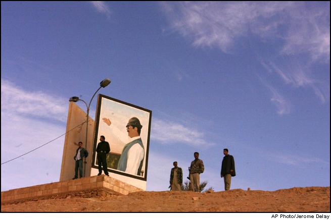 Iraqi men, some with automatic riffles, watch an UNMOVIC vehicle with International Atomic Energy Agency inspectors drive by on their way to the Qaim Ukashat phosphate complex located some 300 kms West of Baghdad near the Syrian border Tuesday Dec. 10 2002. This is the furthest from Baghdad UN weapon inspectors have ventured since resuming inspections last month. |