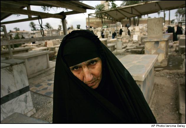 An Iraqi woman walks through the Al Baratha cemetery in Baghdad Tuesday Feb. 11 2003 following the first day of the Eid El-Adha's morning prayers. The Eid El Adha, also known as the feast of sacrifice, is a four-day holiday. |