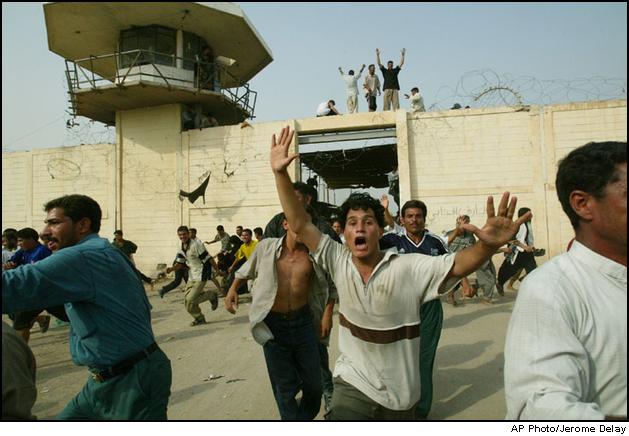 Hundreds of Iraqis storm the Abu Ghureib jail 35 kms northwest of Baghdad following the announcement by Saddam Hussein that most prisoners were going to be freed. Tens of thousands of Prisoners were greeted by their relatives and friends upon their release throughout Iraq. Only death row inmates were not released. |