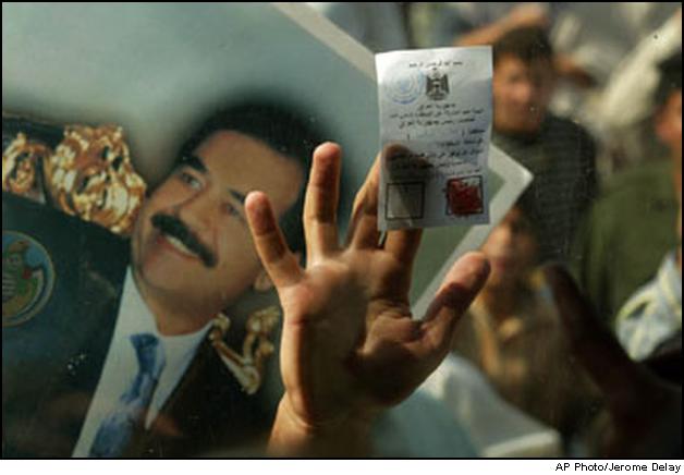An Iraqi man holds his ballot against the window of a bus in Al-Daur, south of Tikrit, before casting his vote in Iraq's referendum Tuesday Oct. 15 2002. The "Yes" box is marked with the man's blood. Iraqis are expected to give their support to President Saddam for the next seven years. |