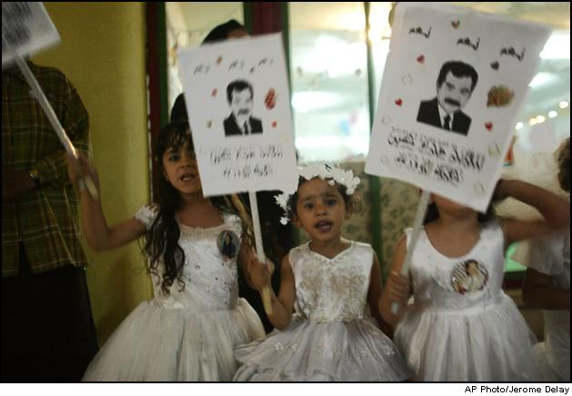 Iraqi school children wave posters of Saddam Hussein as they chant "Yes Yes Yes to Saddam" in the Bilat Al-Shudaa school in Baghdad Sunday Oct. 13 2002 during memorial ceremonies organized by the Iraqi government to commemorate the 15th anniversary of the school's bombing by un Iranian missile that left 30 dead. |