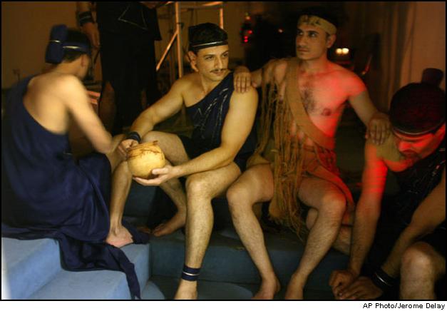 Male models wait backstage before taking part in a fashion show by Iraqi fashion designer Frial al-Kelidar at Baghad's fashion house Thursday Feb. 19 2003. The show, in which a dozen creations were displayed amidst historical costumes, is to travel to the Syrian capital Damascus the following week. |