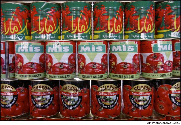 Stacks of imported tomatoe sauce wait for customers in a downtown Baghdad market Monday Nov. 25 2002. Despite sanctions, fruits, vegetables, as well as imported appliances and consumer electronics are piled high in market stalls. |