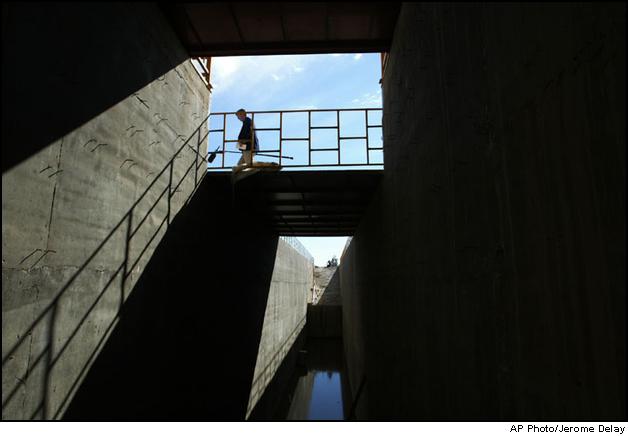 A foreign journalist walks through of the Al Rafah missile engine testing ground near Al Amiriyah, 40 kms (25 miles) south west of Baghdad Friday Feb. 7 2003. Iraqi officials brought foreign journalists to this site to underscore the fact that this and other installations have been under United Nations scrutiny for months. |