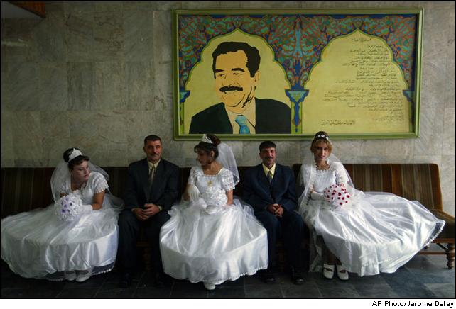 Soon to be Iraqi newlyweds sit under a poster of Saddam Hussein in Baghdad before the start of a group wedding of 155 couples Monday Oct 21 2002. Ech received a suit, a dress, cash from the Iraqi government who also offered the reception. |