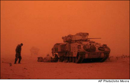 U.S. Army 3rd Infantry Division Sgt. Steven Brussel leans into the wind as a sandstorm at dusk turns the desert red near Karbala, Iraq Tuesday, March 25, 2003. The sandstorm grounded many bombing flights over Iraq and slowed U.S.-led military progress in the area near Karbala. |