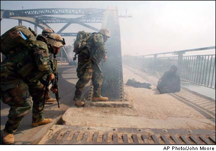 U.S. Army soldiers from A Company 3rd Battalion 7th Infantry Regiment approach an injured woman who was caught in the crossfire with Iraqi forces over the Euphrates River when the U.S. Army siezed a bridge in Al Hindiyah, Iraq Monday, March 31, 2003. |