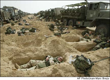 Soldiers from the 3rd Brigade of the U.S. 101st Airborne Division rest in fox holes by their convoy in a staging area in the Kuwaiti desert Friday, March 21, 2003. |