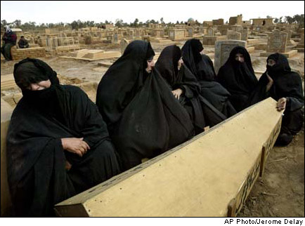 Relatives of Mohammed Jaber Hassan weep over his coffin at the Mohammed Sakran cemetary outside Baghdad, Saturday, March 29, 2003. Hassan, 22, died late Thursday when a bomb fell on a busy Baghdad market, killing 52 and wounding scores. |
