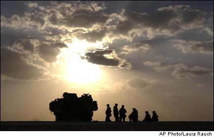 U.S. Marines with 3rd Batt., 7th Marines, 1st Marine Division, meet outside their amphibious assault vehicle on a highway south of Baghdad, Iraq, on Thursday, March 27, 2003. |