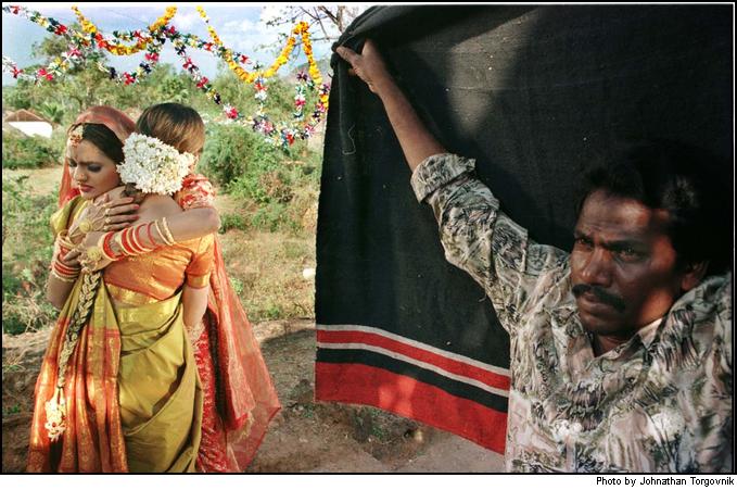 Actresses Madooh and Urmila embrace, and a film crew man blocking the light from the camera by hand holding a black cloth. As labor is very cheap in India, this film crew worker is acting as a human 'flag' for blocking the light, where in western productions a stand would be used. |