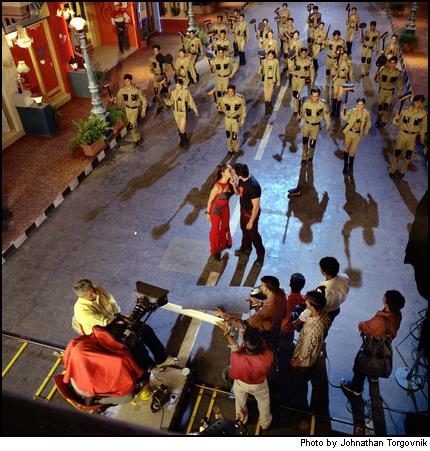 The films produced tend to be spectacular melodramatic fantasies. Romance and erotic dances are just on the border of being banned by the country’s strict censorship regulations love song/dance sequence staring Boby Deol & Bipasha Basu, on the set of “Chor Mach Sohr” at Filmaliya Studios, Mumbai (Bombay). |
