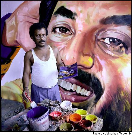 Selvam an artist at Mohan arts studio in front of his freshly painted cinema banner in Chennai (Madras). The cost for these larger than life hand painted advertisements is still cheaper to produce than printed ones. |