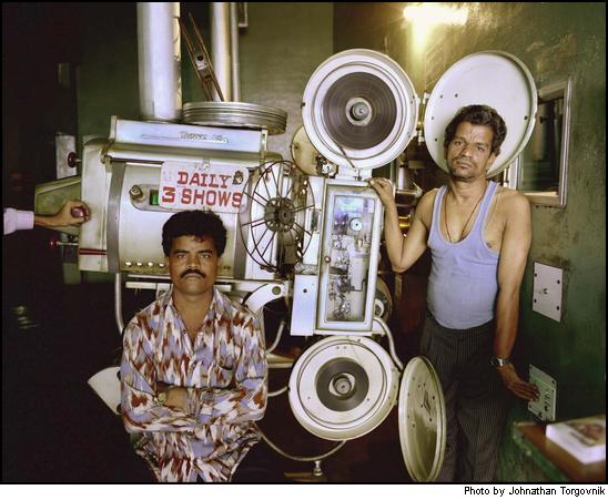 Film projector operators at the "Padmam" theater projection room, Chennai (Madras). Cinema-goers became accustomed to dim projection, poor focus and quavering sound. Things are now changing for the better. |