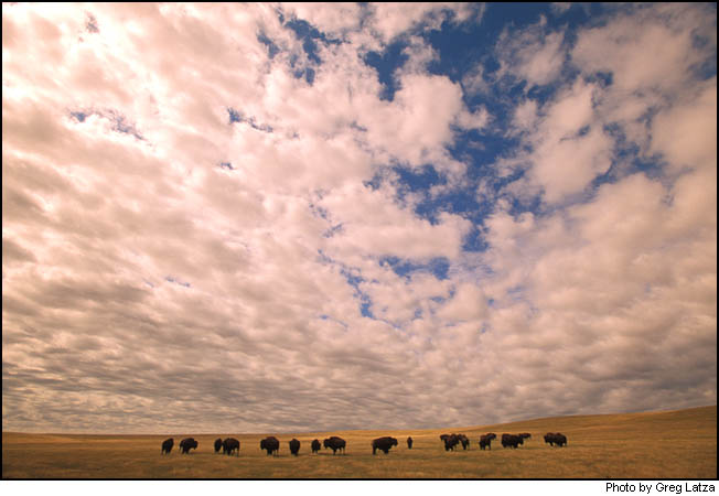 Buffalo congregate amid endless sky and prairie on the Houck Ranch northwest of Pierre. The herd, numbering more than 3,000 animals during good years, ranges over 50,000 acres and utilizes about 150 stock dams. |