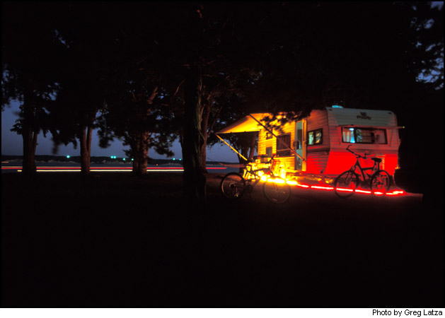 Boats leave trails of light on Lewis and Clark Lake as a family watches television in their shore-bound camper. Although it's summer, strings of Christmas lights offer ground illumination for nighttime activity. Nearly 2 million outdoor enthusiasts visit Lewis and Clark Lake each year, participating in fishing, hiking, sailing, swimming, archery, biking, birdwatching, diving and other outdoor activities. |