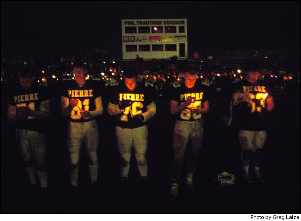 The Pierre Governors and their fans participate in a candlelight vigil following their homecoming football game September 14, 2001. The vigil honored victims of the World Trade Center and Pentagon terrorism attacks which had occurred just three days earlier. The Governors lost to the Sioux Falls Lincoln Patriots 14 to 21. |