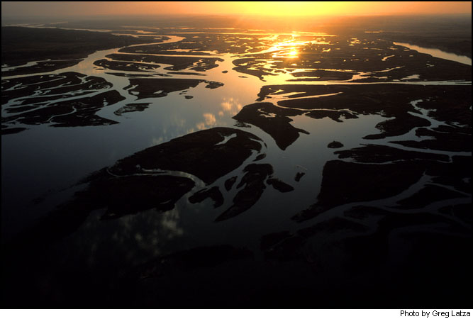 The Missouri River is transformed into dozens of winding channels and shallow backwaters between Springfield and Running Water. The vast network of marsh, sandbars and sediment is a result of silt deposited by the Niobrara River, which empties into the Missouri upstream. |