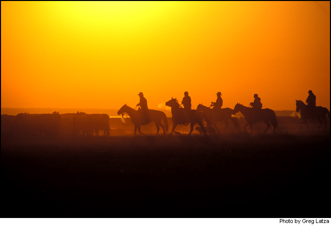 Branding is a spring ritual in ranch country, uniting neighbors in the spirit of teamwork and camaraderie. Cowboys commence the annual roundup at Todd Mortenson's ranch as the Cheyenne River glistens in the distance. "It's something that I look forward to in the spring," explains Mortenson. "I like to get mine done and then go help everyone else. I don't have to think or plan, I just take orders." |