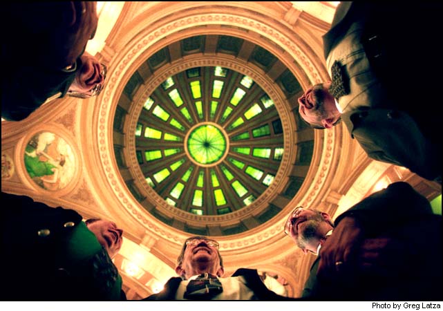 Below the CapitolÕs copper dome, embellished with stained glass windows and painted murals, state lawmakers meet for two months each spring. Here, a group of Sioux Falls businessmen discuss a successful morning meeting with legislators. |