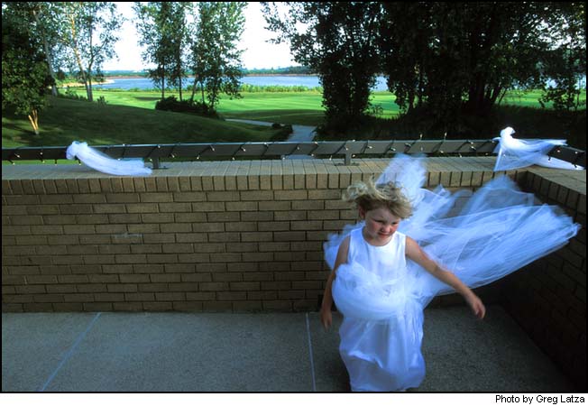 Flower girl Haylee Twillman, 4, catches a cool breeze before heading back into the Dakota Dunes clubhouse for the reception celebrating her aunt Mindy Musselman's wedding to Chris Miller. Behind her, the Missouri River and the 18th green of Dakota Dunes Golf Course soak up the evening sun. |