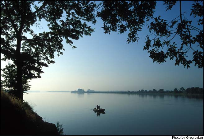 Fishermen pause on the Missouri River's glassy surface during a foggy July morning east of Yankton. Below Gavins Point Dam, the Missouri returns to its treacherous, beautiful self until it becomes channelized at Ponca State Park in Nebraska. |