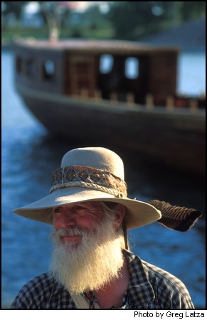 David Cain, impersonating hunter John Colter, talks with visitors at the mouth of American Creek during a 2001 visit by the Lewis and Clark Discovery Expedition of St. Charles, Missouri. The organization uses a replica 55-foot keelboat to travel the river, stopping to offer tours and educational discussions. "There's nothing better than floating this great river in the same fashion as our forefathers," says Cain. "It's an experience everyone should have." |