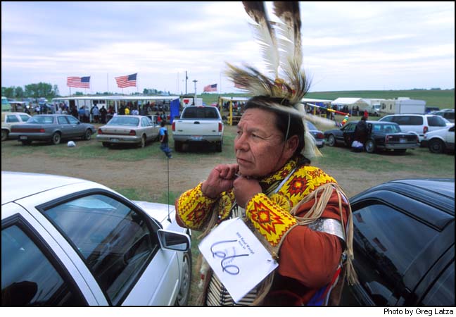 Sylvan Beautiful Bald Eagle, a traditional dancer from Wakpala, ties on his feathers prior to the 9th Annual Kenel Wacipi. "It's been two years since I danced," he said. 'This is a great place to start again." |
