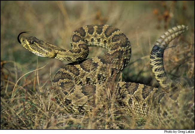 An agitated rattlesnake tests the air on the prairie north of Mobridge. The prairie rattlesnake can grow to nearly five feet in length, and it's not uncommon for several hundred to congregate in a single prairie dog colony prior to winter. |