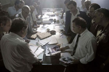 The Israeli cabinet in the film "Munich" looking over photographs of the suspected Black September operatives who were to be hunted down and killed as a result of what they did at the 1972 Olympics. Photo by Karen Ballard/Universal |