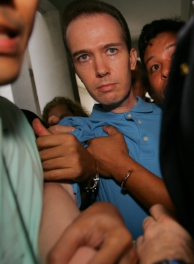 American murder suspect John Mark Karr, 41, is pushed through the media scrum by U.S and Thai authorities at the Immigration office, Aug. 17, 2006, in Bangkok, Thailand. His arrest and extradition seemed to be a breakthrough in the high-profile, decade-old murder case of 6-year-old beauty queen JonBenet Ramsey. DNA results, however, later disproved his confession.