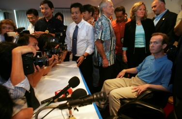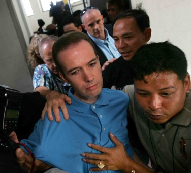 For the next 4 or 5 days until Karr departed for the States, I shot whatever I could because the American publications soaked everything up. Working alongside the American Embassy personnel on Sunday, the day Karr departed, the Thai authorities were extremely helpful giving us all space to get our shots behind the lines set up. I wasn't satisfied with just getting his departure to the airport but neither was the rest of the international media, many of whom had flown to Thailand to do their own coverage. We all raced to the airport following the van and quickly created an embarrassing media scrum at the international airport that would have never been tolerated in most countries. We lost him as he was led into Immigration; never mind that I had also lost my earrings, my sunglasses were crushed and my fanny pack was wide open, my wallet on the floor. It was the worst media crush I had experienced in years!