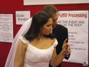 Yes, the phrase "posed photojournalism" would seem to be a contradiction in terms but not according to Doug Gordon, a wedding photographer who was leading a demonstration at the EventPix.com booth of his techniques for capturing bride and groom shots that look spontaneous but are actually posed. In the last decade, the photojournalism-style of shooting weddings has become increasingly popular. The only problem is that it takes tremendous skills of anticipation and reaction -- not to mention much better than average photography skills -- to capture attractive "photojournalistic" wedding shots. To increase your chances of getting good spontaneous-looking pictures, Gordon recommends simply posing your bride and groom but in such a way that it doesn't look like those stiff old wedding photos your grandparents took. With a digital SLR in his hand, Gordon walked bride and groom models through a series of poses that produced artful, spontaneous-looking pictures. The one caveat is you need to have a couple that is cooperative since some of the poses -- including several that Gordon did with the models lying on the floor -- looked uncomfortable. You can find information about Gordon's DVDs at www.douggordonworkshops.com