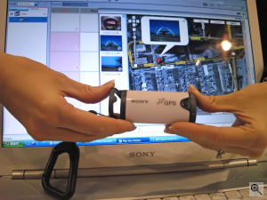 Though Sony's Alpha DSLR-A100 camera was still attracting a lot of attention at PhotoPlus, there was a much smaller unit at the Sony booth that was also generating buzz. Called the GPS-CS1, the GPS device uses time and location recordings and the time stamp from a Sony digital still camera or camcorder to literally put your photos on the map. The tiny device -- just 3.5-inches long and only two ounces -- is a 12-channel GPS unit that's sold with a carabineer to attach to your belt loop. Once you're done shooting India's Taj Mahal or the Eiffel Tower in Paris, import the logged data from the device using the USB cable and transfer the images to a computer. With the help of the supplied GPS Image Tracker software, images from your digital camera or camcorder are synchronized with the latitude, longitude and time readings from the GPS-CS1 device. After you activate the Picture Motion Browser software bundled with Sony's latest cameras, your photos will then pop up next to push pins on Google Maps by the actual location where you made the picture. Retailing for $150, the Sony GPS-CS1 will not only help you impress your friends with where you've been but also flaunt your talents as a travel photographer. www.sonystyle.com