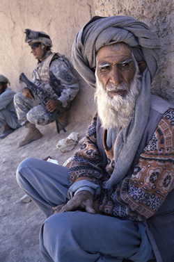 As his village is searched, an old Afghan man sits next to a U.S. Army soldier in Mani Kheyl, Afghanistan.