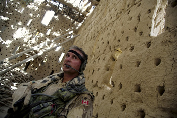 Major Innis of the Canadian Army stands in a warehouse once used to dry grapes but more recently used by the Taliban as both a strategic and defensive bunker because of its small openings. Afghanistan.