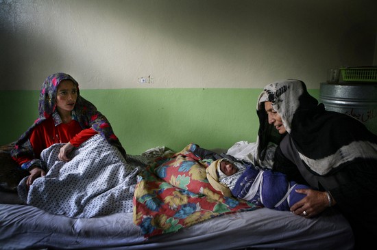Afghanistan – Qamar, left, a 26-year-old tuberculosis patient, sits in her hospital bed with her newborn son and mother-in-law, Khalisa, inside the recovery room at Faizabad Provincial Hospital, Faizabad, in Badakshan province, Afghanistan, May 11, 2007. Qamar, who already lost her first child from the natural delivery about two years ago, delivered the second baby by cesarean section this time. However, her health conditions deteriorated from an unknown cause, and she suffered from postpartum complications such as meningitis, hypothermia, and toxoplasmosis. She later died in the hospital on May 20, leaving the baby and the husband behind. The family was so poor that they could not afford the blood she needed, which costs about $100 USD.